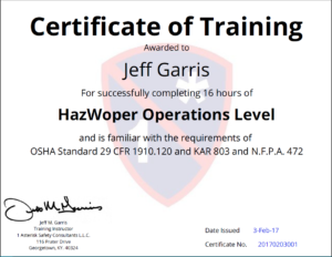 Congratulations to this month’s Certificate of the Month winner, Jeff Garris, President of 1 Asterisk Safety Consultants LLC! Based in Georgetown Kentucky, 1 Asterisk Safety Consultants provides training for the construction industry in the areas of OSHA compliance, Hazardous Materials, First Aid Training, etc. A retired professional Firefighter, Jeff saw a need for continued safety training within these fields to promote safety and readiness response. Jeff currently provides training on OHSA related topics throughout the United States.