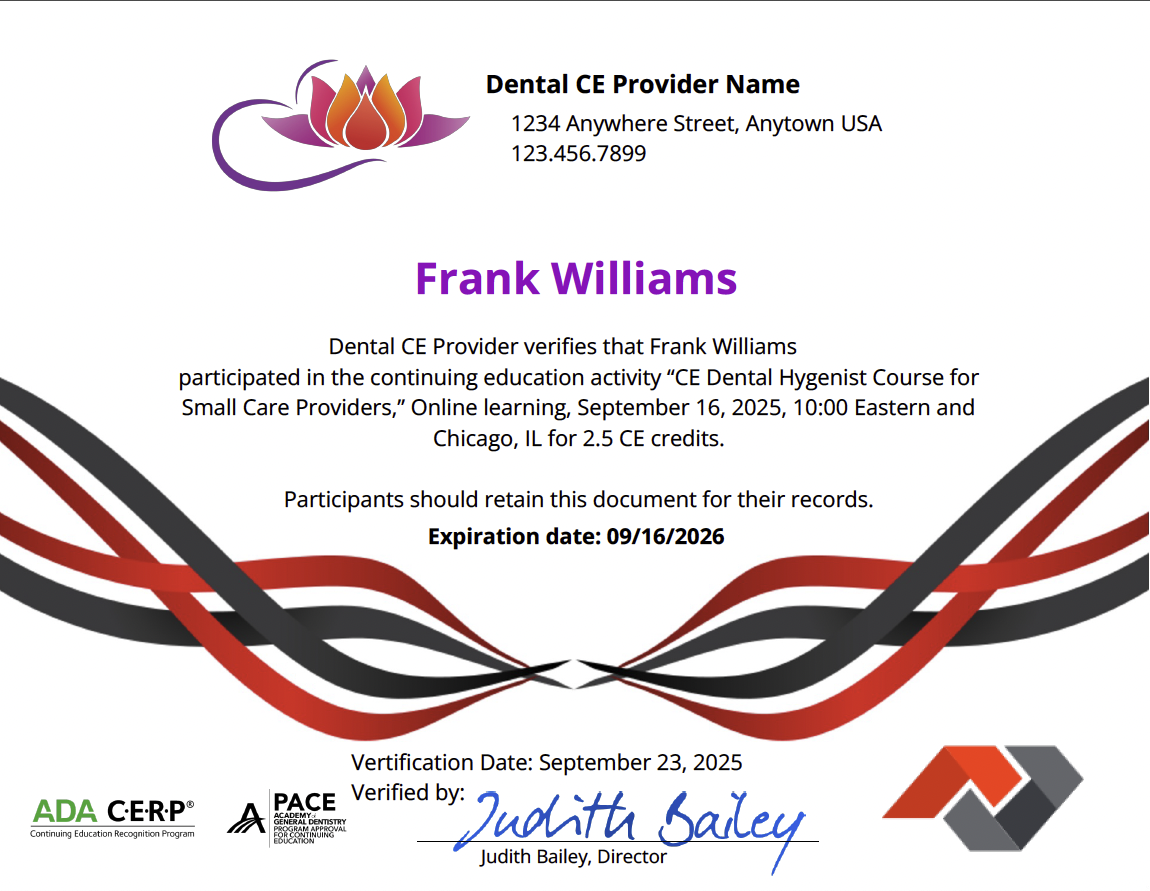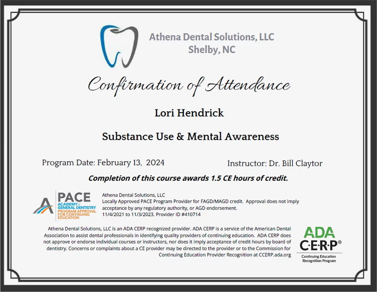 Athena Dental Solutions LLC, located in Shelby, North Carolina! Athena Dental Solutions was established in 2006 as a crown and bridge laboratory by Lori Hendrick, initially for OSHA and HIPPA Compliance. In 2008, Lori expanded her business to include CE Courses for dental providers. Starting in September of 2022, Athena Dental Solutions became certified as DCE provider for ADA CERP. Lori Utilizes SimpleCert for her Digital Certifications.