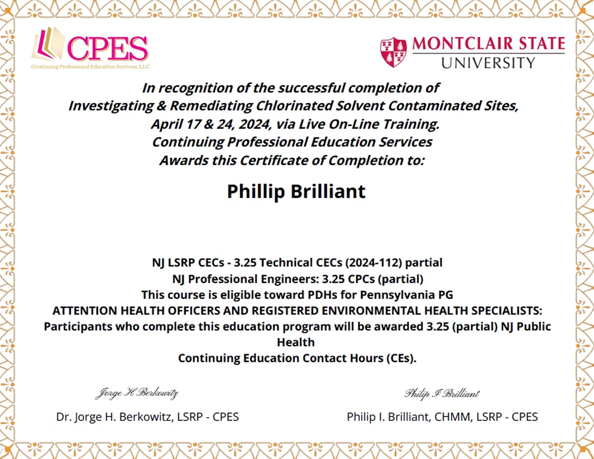 Continuing Professional Education Services, LLC (CPES) is a private company providing continuing education services to licensed and certified professionals in New Jersey and the surrounding region. Founders Dr. Jorge Berkowitz, LSRP and Philip Brilliant, CHMM, LSRP saw the need for a program offering continuing education courses for their own licenses and developed CPES on the campus of Montclair State University but has now spread to other university campuses in NJ.