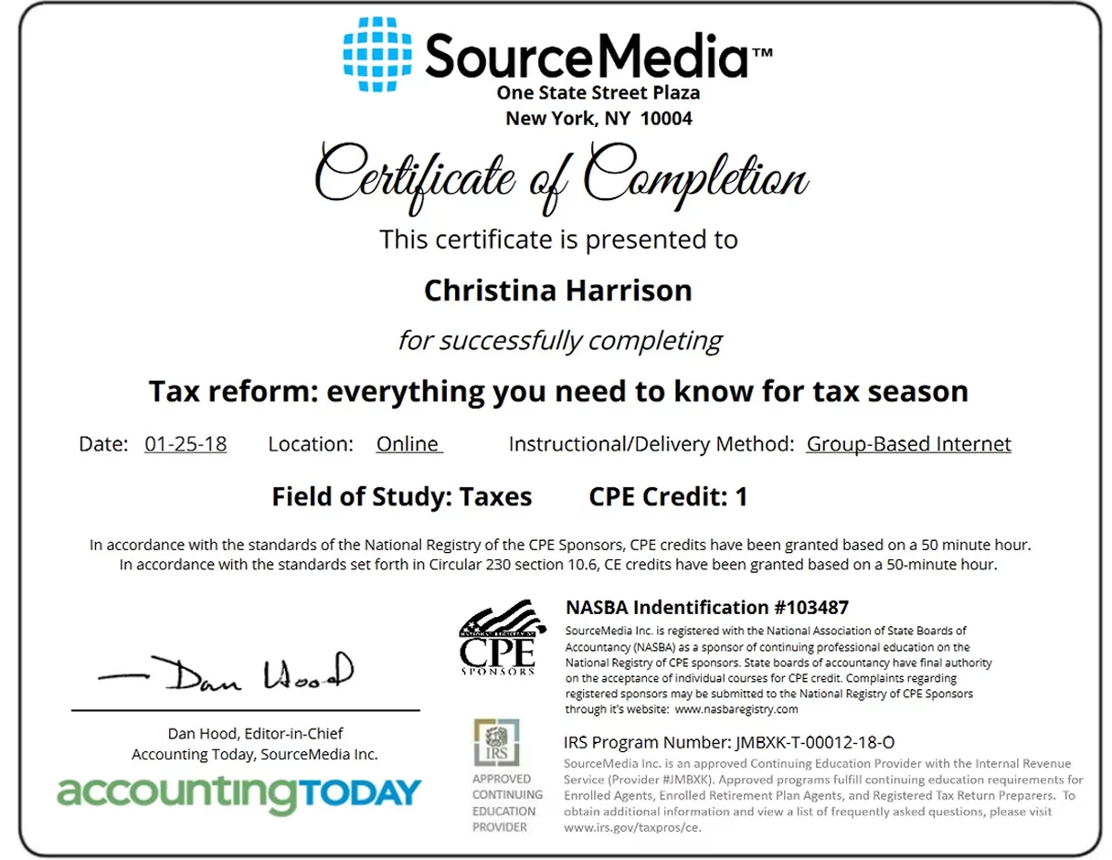 SourceMedia is also an Internal Revenue Service designated Approved Continuing Education Provider, and on occasion provides additional IRS based certification for webinars.