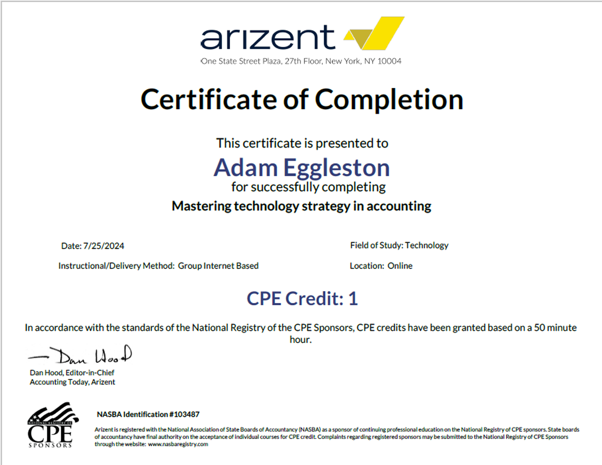Arizent is a digital marketing company based in New York City. Accounting Today, which is a publication managed by Arizent, routinely produces webinars that are approved for CPE accreditation.