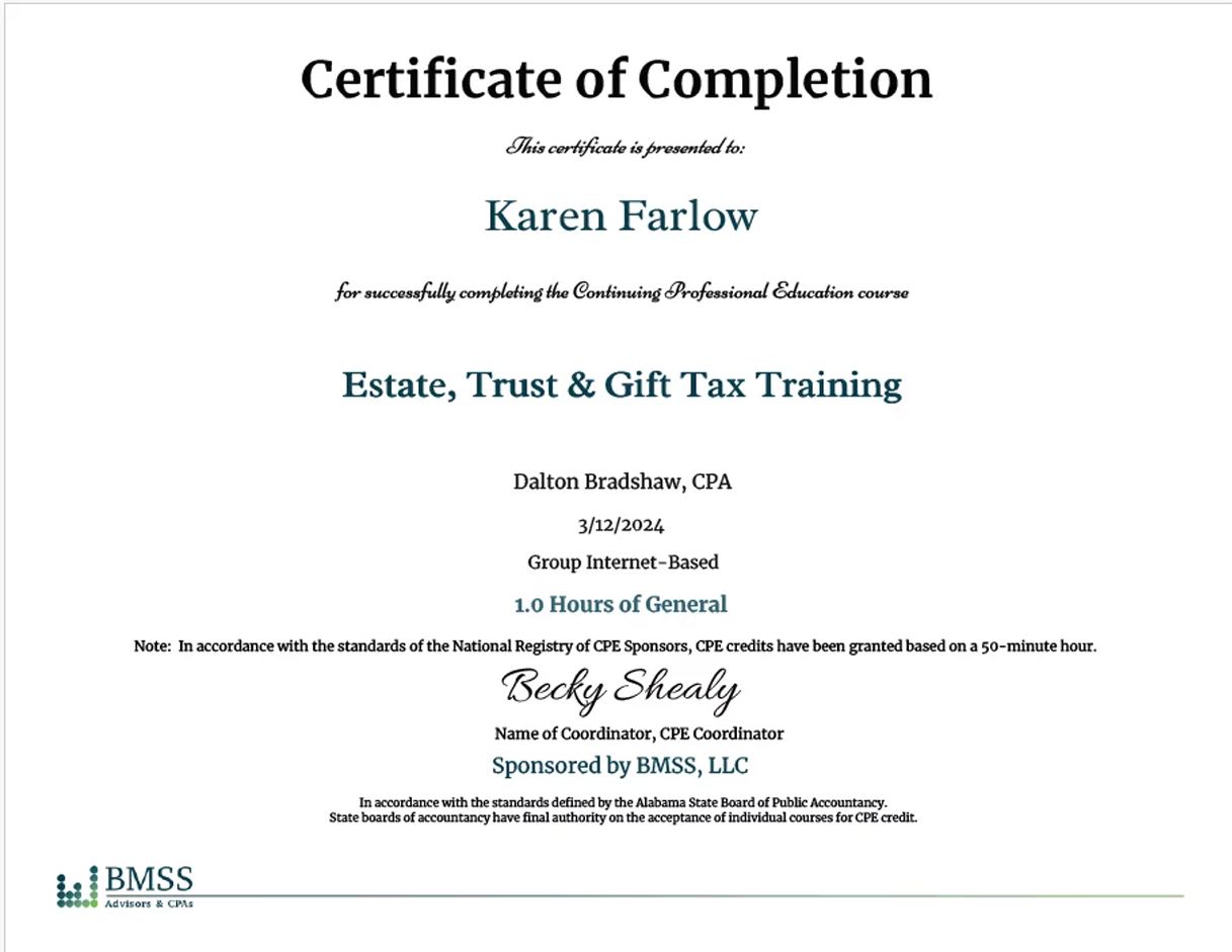 BMSS, LLC is a CPA firm with locations throughout Alabama serving closely held businesses in various industries including construction, manufacturing, credit unions, nonprofits and technology. They provide CPE credits to their attendees participating in in-person events.