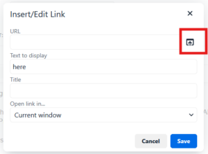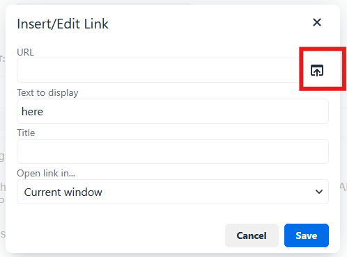 In the “Insert/Edit Link” popup, click on the upload button to find and upload the document you wish to attach, and then confirm the Text you wish to display as the hyperlink is still correct: